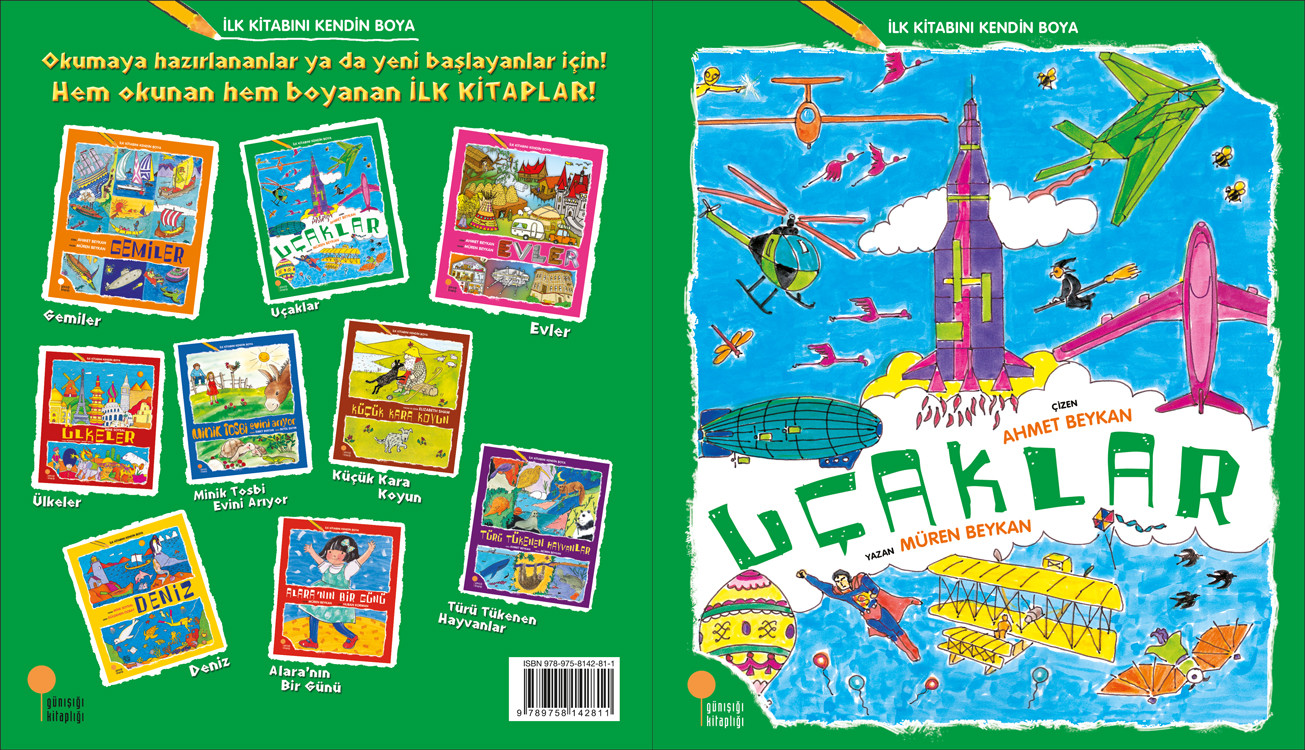 The book contains nine sections introducing various kinds and different functions of aircrafts to children and explaining the flying experience in its historical perspective. The first attempts to fly; the balloons, the first airplanes, the Zeppelin, passenger airplanes, helicopters, gliders, jets and of course space vehicles! The creatures which are the source of inspiration for aircrafts and the heroes identified with them add humour to the drawings.